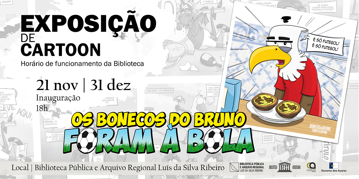 A Biblioteca Pública e Arquivo Regional Luís da Silva Ribeiro inaugura às 18:00 do dia 21 de novembro uma exposição de Cartoon, do terceirense Bruno Rafael, com trabalhos inéditos sobre um tema muito apreciado pela maioria das pessoas: o futebol.