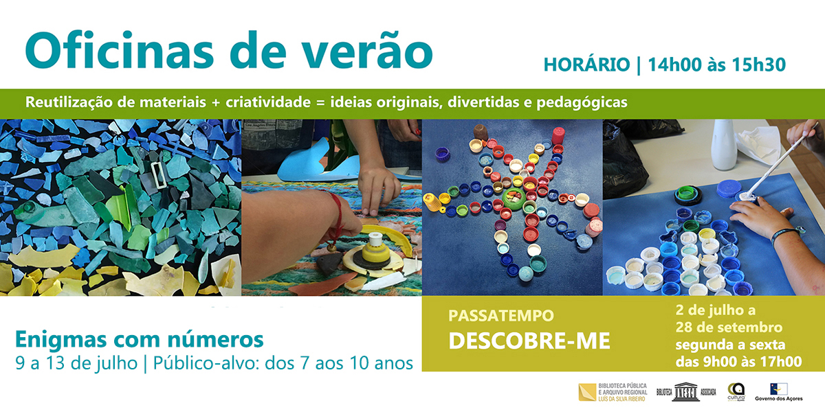 A Biblioteca Pública e Arquivo Regional Luís da Silva Ribeiro, no âmbito da mostra bibliográfica “Mutatis mutandis”, dinamiza a oficina “Enigmas com números”, desafiando as crianças a brincarem com os números e a construírem jogos lúdicos e pedagógicos. Exercitar a criatividade e proteger o ambiente, será o nosso lema deste verão!