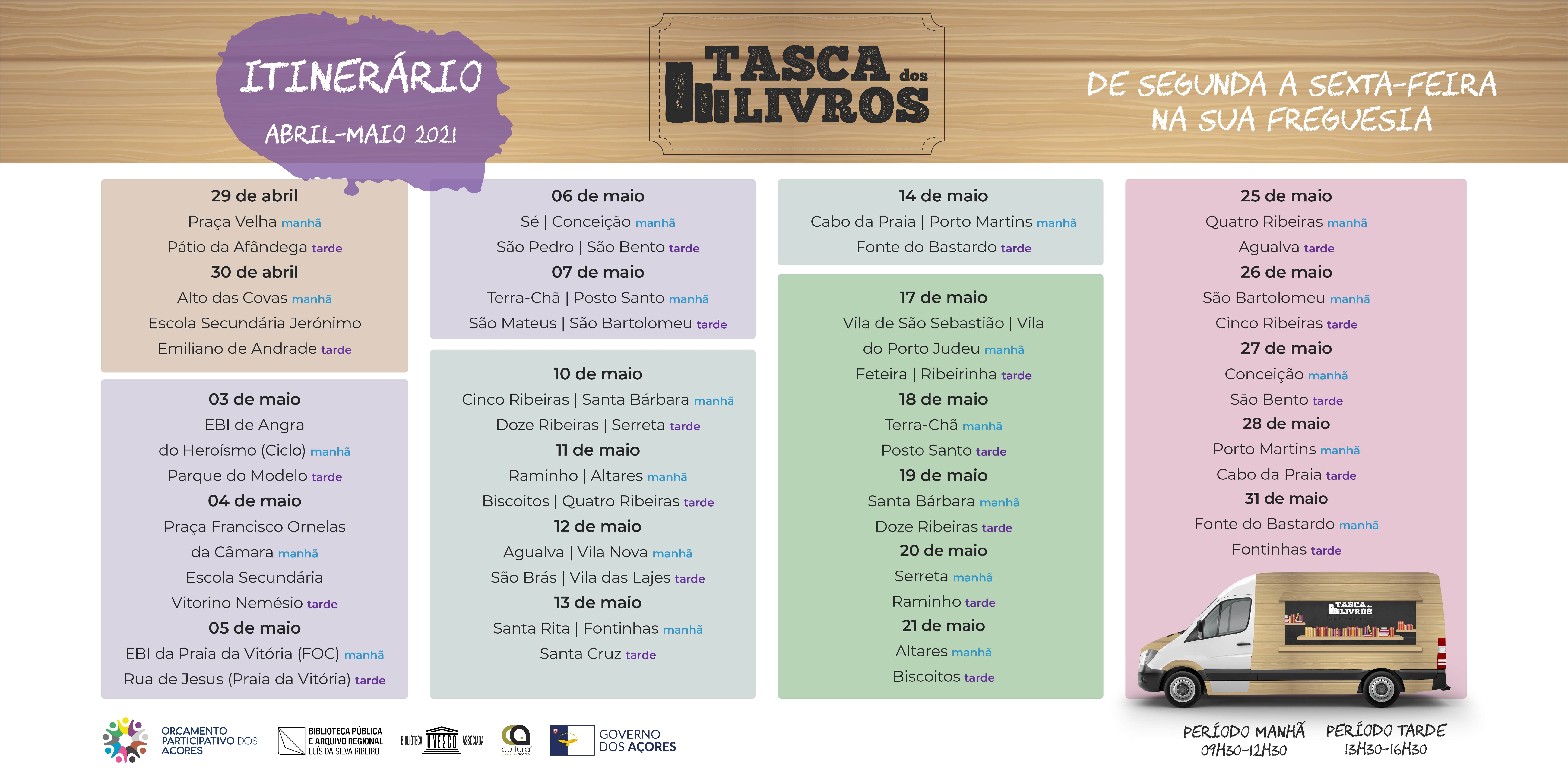 Depois de inaugurada a biblioteca itinerante “Tasca dos Livros”, a Biblioteca Pública e Arquivo Regional Luís da Silva Ribeiro disponibiliza, agora, o itinerário da carrinha para os últimos dias de abril e para todo o mês de maio.