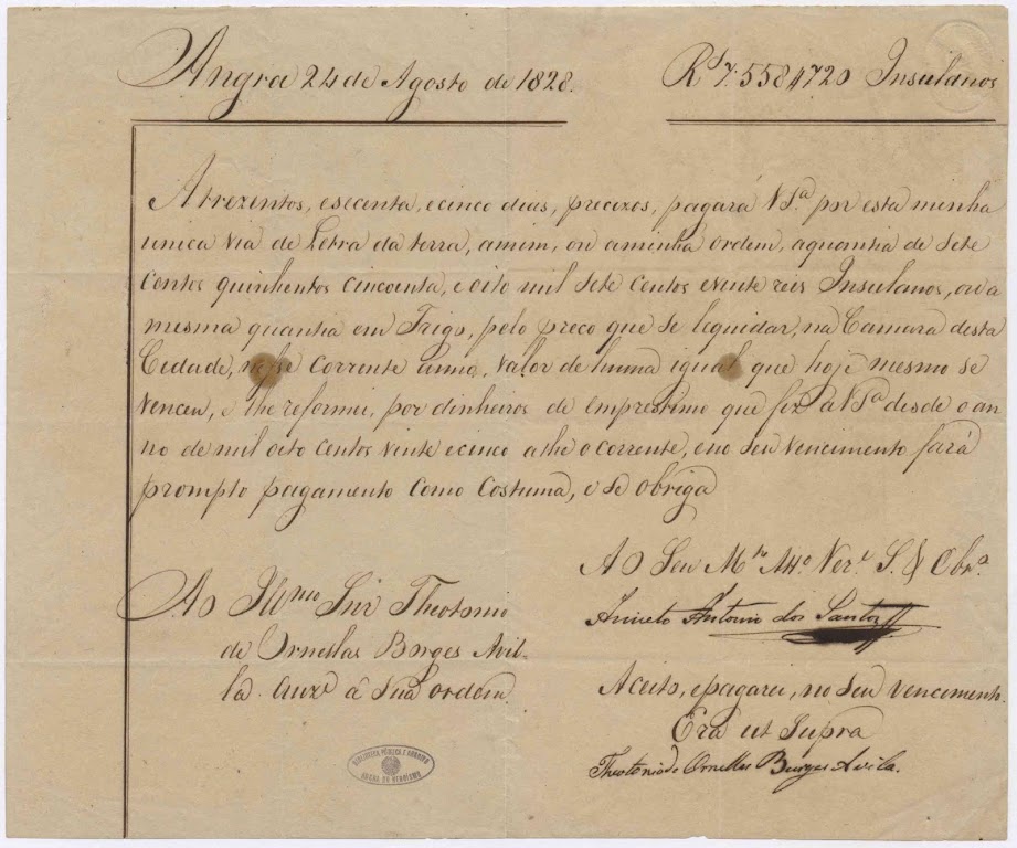 Letra no valor de 7.558$720, moeda insulana, em que é devedor Teotónio de Ornelas a Aniceto António dos Santos. Angra, 24 de agosto de 1828.