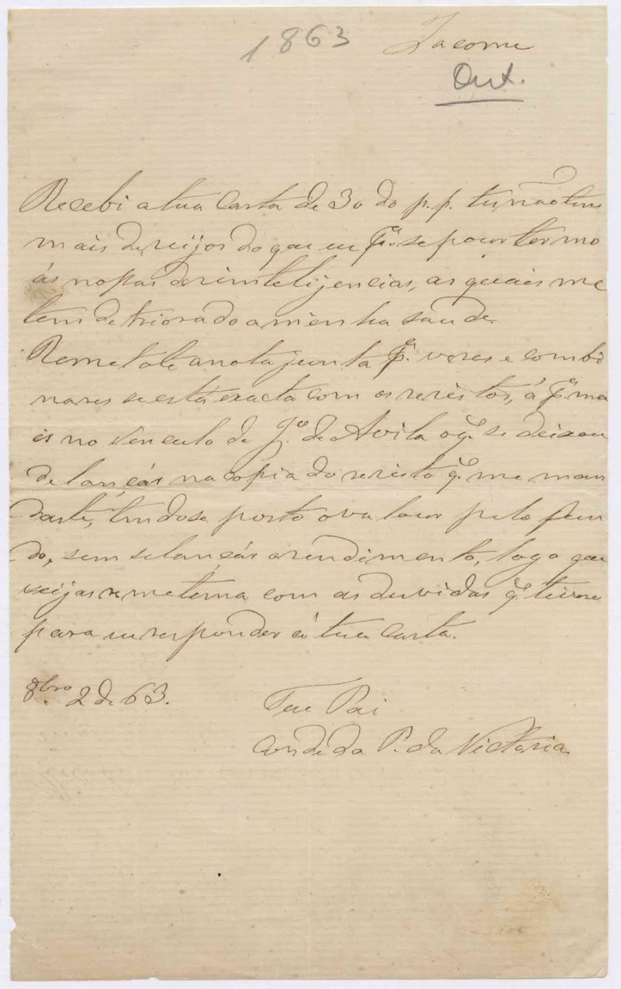 Carta de Teotónio de Ornelas dirigida a seu filho Jácome de Bruges, manifestando o desejo de terminar os desentendimentos entre pai e filho. [Angra do Heroísmo], 2 de outubro de 1863.